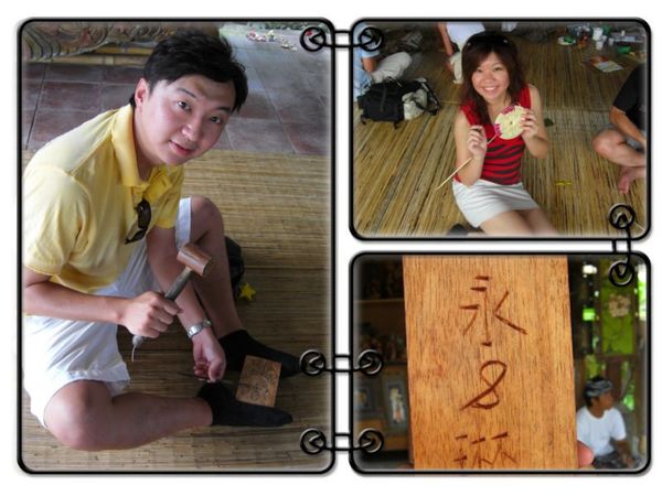 吃完了,導遊就要帶我們去烏布藝術村~~ㄟ..烏布藝術村...只是個用棚子搭建成的一間小屋子..裡面有五六個當地師傅教授手工藝品,有木雕,草編,畫畫等等..我選用用草編成的杯墊,比比選木雕~其實就是基本雛型都已經做好了,我們只是把他做結尾的動作~