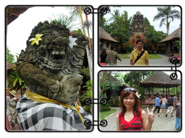 在這約待了半個小時,大家各自帶著自己的作品準備去烏布市場shopping囉~~我從第一天就跟比比說我要買沙龍,終於等到第三天才有機會去買~~~一到烏布市場我就往沙龍進攻~~~結果果然一開始買就是會買貴..唉..算了~~反正開心就好 哈哈~ 可是我一直想買的珠珠繡花鞋卻看不到什麼好看的...所以沒買到,比比在這買到了貓咪日曆,準備送同事. 等到我們都買得差不多集合的時間還沒到,就先到前面的烏布皇宮逛逛. 烏布皇宮真的是非常小也很破舊,應該是當地政府沒有在維修吧~~不過這的石獅像頭上都有別小花,真是可愛~~