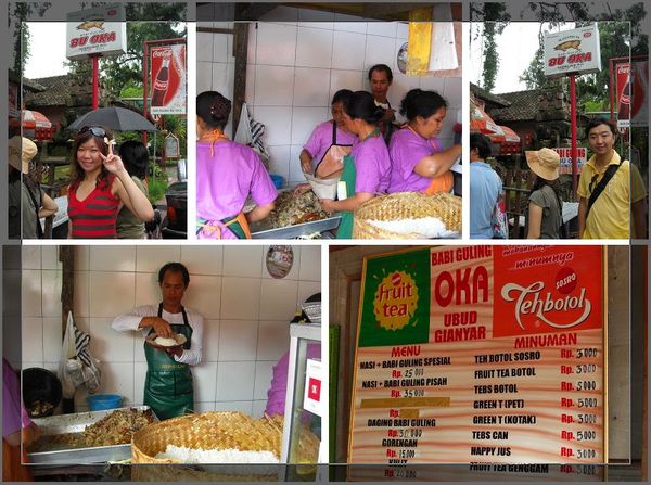 突然比比想起來,烏布皇宮幕近有賣有名的烤豬飯,拿出我們的秘笈,很快就找到那家店~~還真的很多人在排隊~我們倆當然馬上去排隊準備帶回villa享用..可是當看到餐廳人員全程都是用手抓,,讓我們倆覺得不太衛生,不過還是硬著頭皮買了一份...