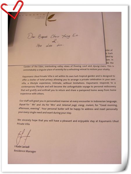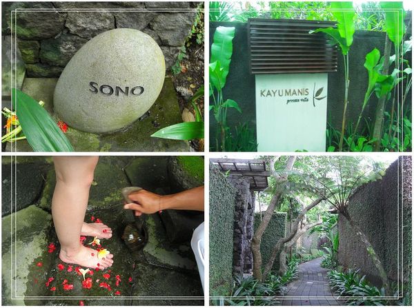 等買完烤豬販也差不多到了集合的時間~導遊就要帶我們去我們的Villa Kayumanis check in 囉~~ 烏布是個比較屬於文化藝術的集散地,如果你很愛當地藝術,像雕像,油畫等等,來這就對了,Kayumanis villa 離烏布市區有一段距離,路也很難找,司機都有點迷路的感覺. 一路上都是坑坑洞洞,但一到我們的villa 就有柳暗花明又一村的感覺~~ 這的服務是以貼心出名的, 果然一下車服務人員就馬上來招待我們,還給我們一人一朵迎賓花朵~~ 等check in之後,服務人員就帶我們認識周遭環境並帶我們去我們的villa~ SONO就是我們villa的名字喔~~ 一進去,服務人員跟我們說,進門要沖腳三次的習俗,意思是" clean mind, clean body and clean soul"