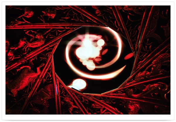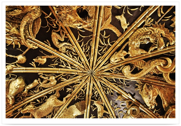 上面是12生肖的金色雕刻,往下正對一個上有十二星座雕刻的輪盤弧狀蓋,兩個看起來都像是可以打開的,