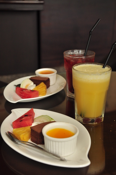 **附餐也不馬虎,有新鮮果汁跟蛋糕,水果**