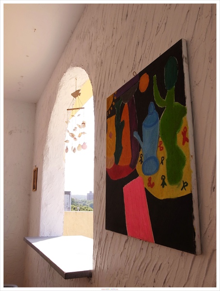 灑滿色彩的油畫掛在牆上為刷白的牆壁添加些許趣味