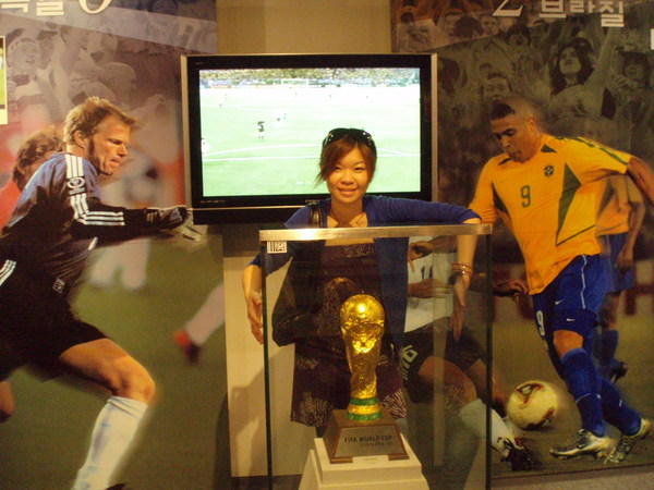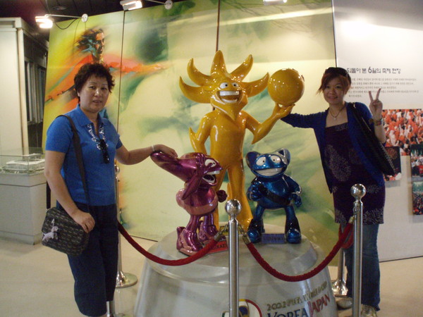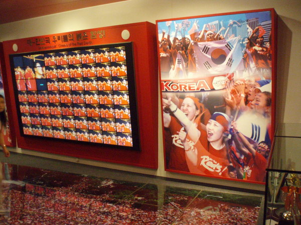 下午的行程是先去我們第一天沒去成的世足體育館~~~ 裡面想當然爾都是展覽當初2002年在韓國舉辦世足賽的盛況~~(就是韓國作弊的那一次!!!) 看到裡面的展覽...突然覺得怎麼這麼眼熟!!! 照片都是紅壓壓的一片~~齁!!! 原來台灣反扁的紅衫軍構想就是來自這啊!!! 范可欽啊....原來你也不過是抄襲....被發現了齁~~~