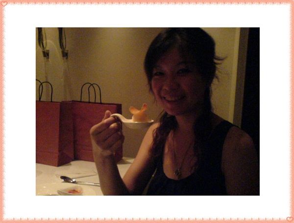 半顆的檸檬細心的包在紗布裡,避免了擠汁時四處亂濺的尷尬,切了一半的鮮紅大龍蝦,上頭淋著帶有濃濃奶油香的醬汁,不同於一般外面軟軟口感,一口咬下去,帶著新鮮有嚼勁的口感,旁邊另有附一碗帶著橘紅色令人食指大動的沾醬,沾或不沾都很好吃~~~